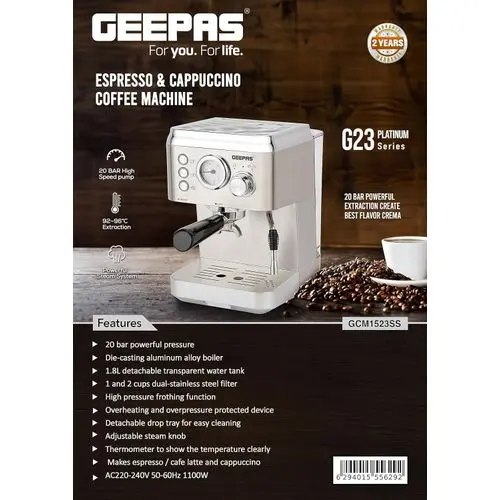 - The Geepas espresso and cappuccino coffee machine has a sturdy construction with a die-cast aluminum alloy boiler for even heat distribution.