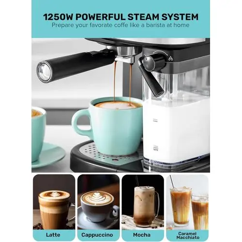 Powerful 20-bar pressure system, this coffee machine will deliver robust and flavorful coffee shots every time. The high-pressure frothing function creates creamy, foamy, and velvety foam for your cappuccinos and lattes