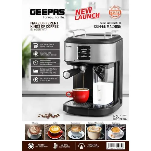 Geepas Espresso and Cappuccino Coffee Machine- GCM1215SA| Equipped with 20 Bar High Pressure Pump and Powerful Steam System.