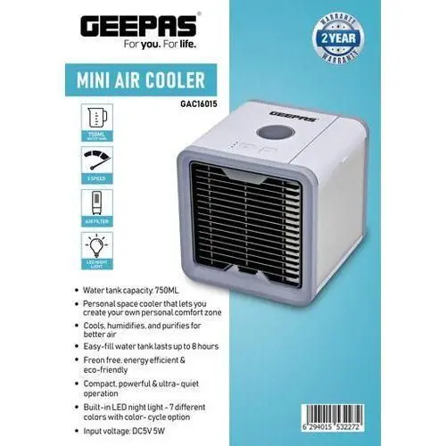 Geepas Mini Air cooler has a 750 ml easy-fill water tank that lasts up to 8 hours