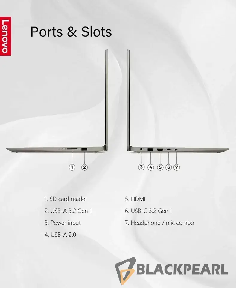 - Ports and Specs: 14.14" L x 9.31" W x 0.78" H, 3.64 lbs. Included Ports and Specs: 1 x USB 3.0 Type-C port, 1 x USB 3.0 Type-A port, 1x USB 2.0, 1x Multi-format SD media card reader, 1 x HDMI, 1 x Headphone/Microphone Combo Jack, 1 x AC connector, 1 x HDMI Out, WiFi 6, Bluetooth, Lenovo 720P Camera, Up to 6.1 Hours Battery Life.
