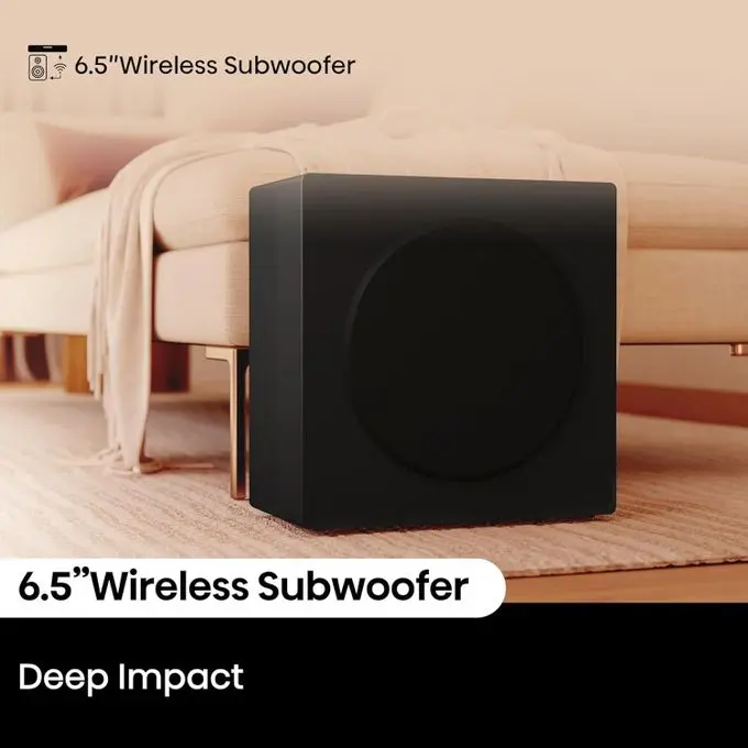 Powerful wireless subwoofer for deep, impactful bass, adding richness and depth to your audio.